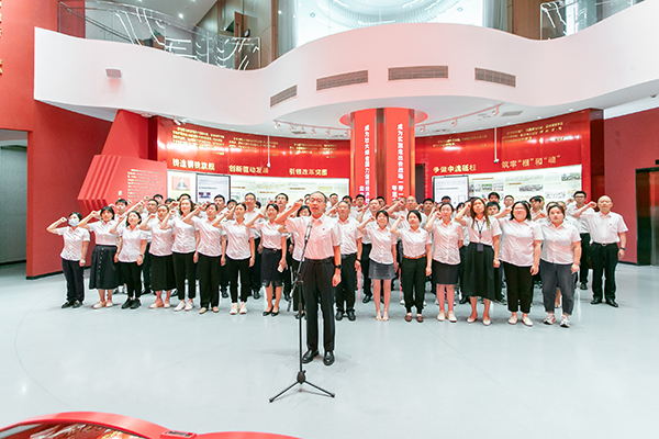 参观结束后,在陈岩峰的带领下,全体人员面对鲜红的党旗,高举右手,紧握拳头,高声宣读入党誓词,抒发着对党的无限敬仰和忠诚热爱。一句句铿锵有力、掷地有声的誓言在庄严的展厅久久回荡,点燃了全体党员爱党敬党的激情和为共产主义奋斗终身的决心。